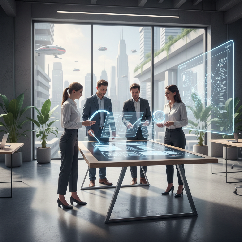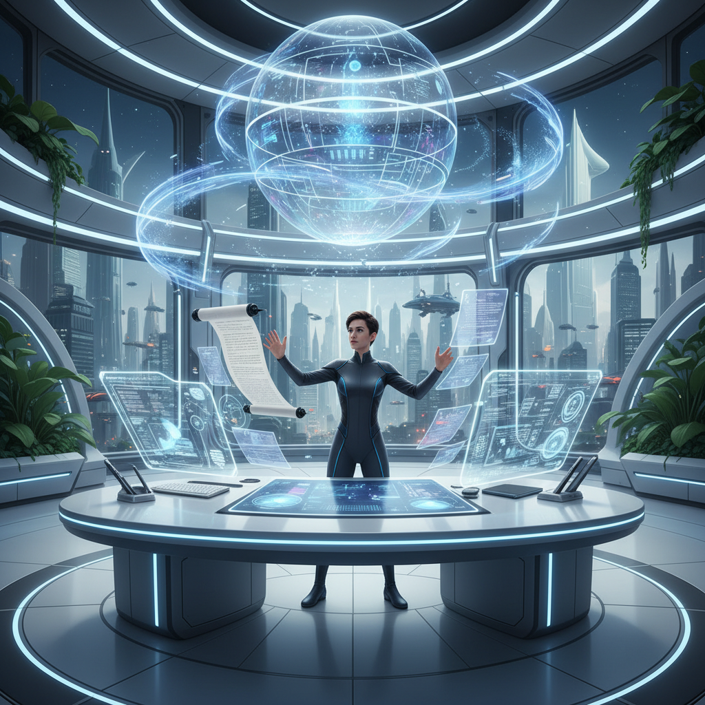 Alt text: Next-generation workspace with holographic document editing, alternative to traditional word processors.
