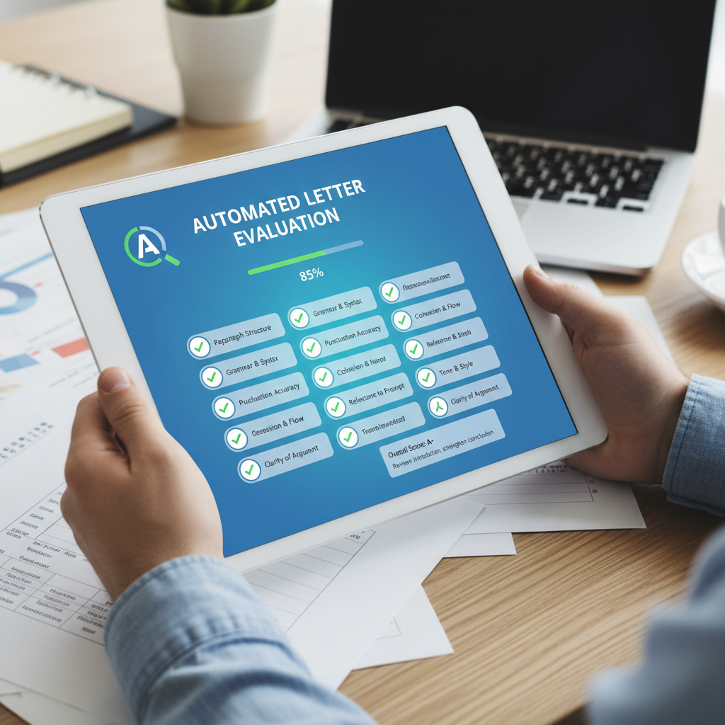 Alt text: Modern digital tablet displaying a checklist for evaluating automated letters, with clarity and personalization as key points
