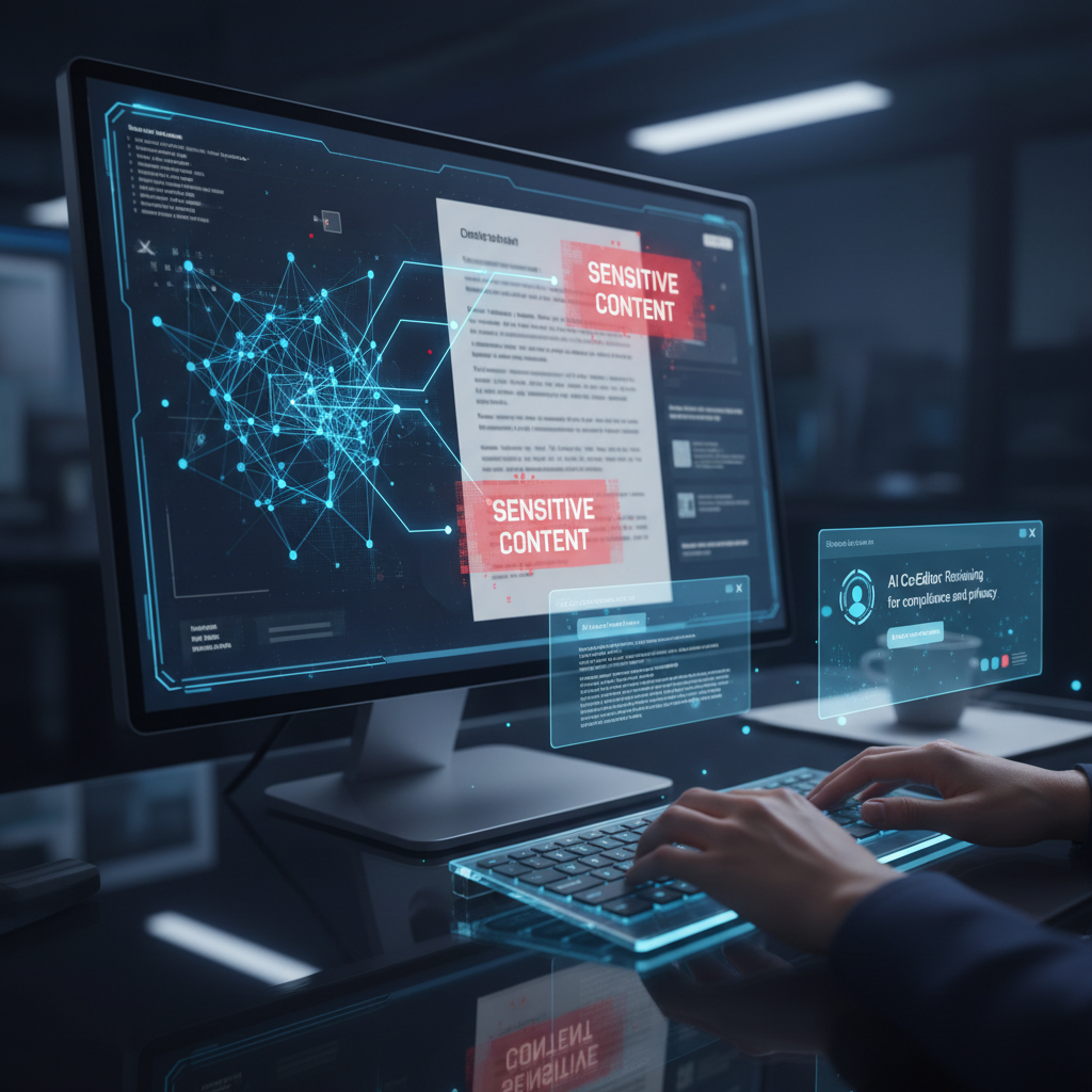Alt text: AI highlights sensitive information during collaborative document editing on a laptop for secure management