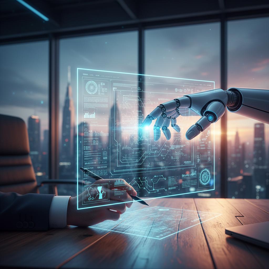 Alt text: Futuristic AI-driven document workspace with transparent AI interfaces, showing the convergence of automation and ethics in document generation.