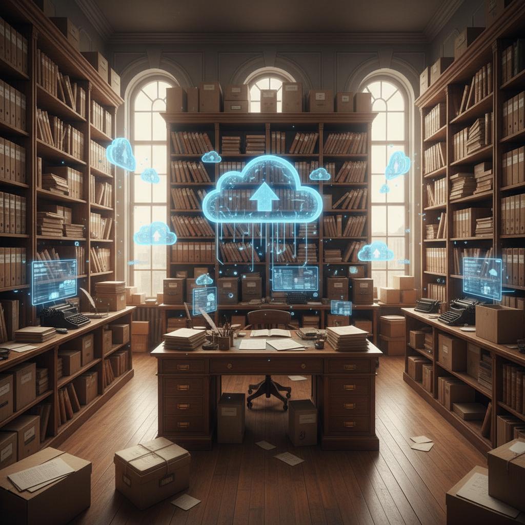 Alt text: Historic office files blending into digital cloud icons, illustrating the shift to cloud document generators and digital workflow tools.