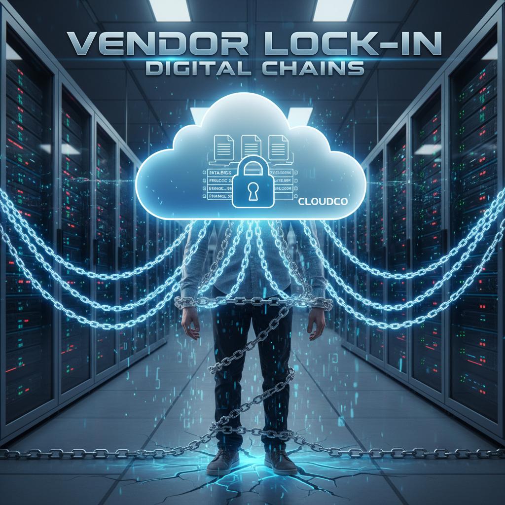 Alt text: Vendor lock-in and document migration risks, with tangled digital chains around a glowing document, relevant for cloud doc generator 2025.