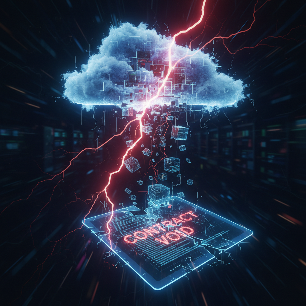 Alt text: Digital contracts leaking from a broken cloud icon in a dark, neon-lit cityscape, symbolizing contract creation software data risk.