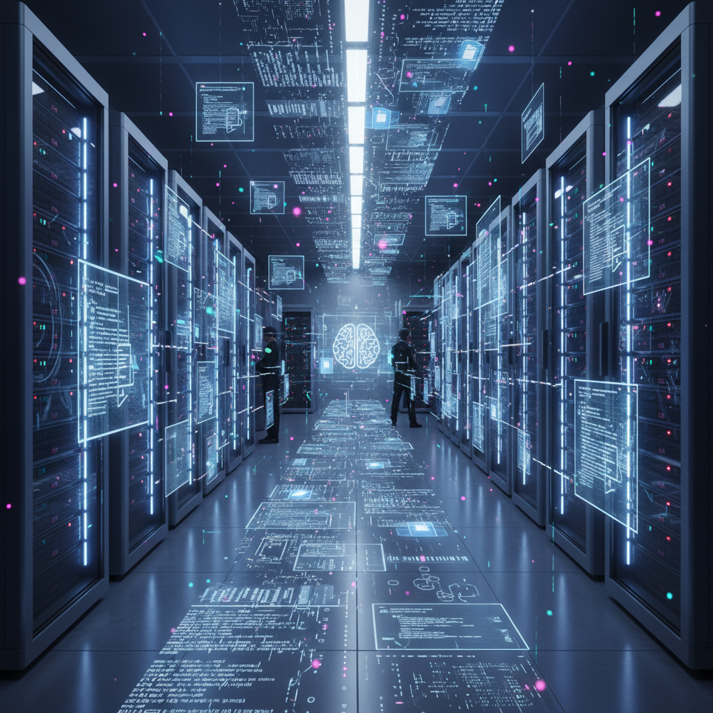 Alt text: Server room scene overlaid with AI code and digital documents, visualizing document automation integration technology stack.