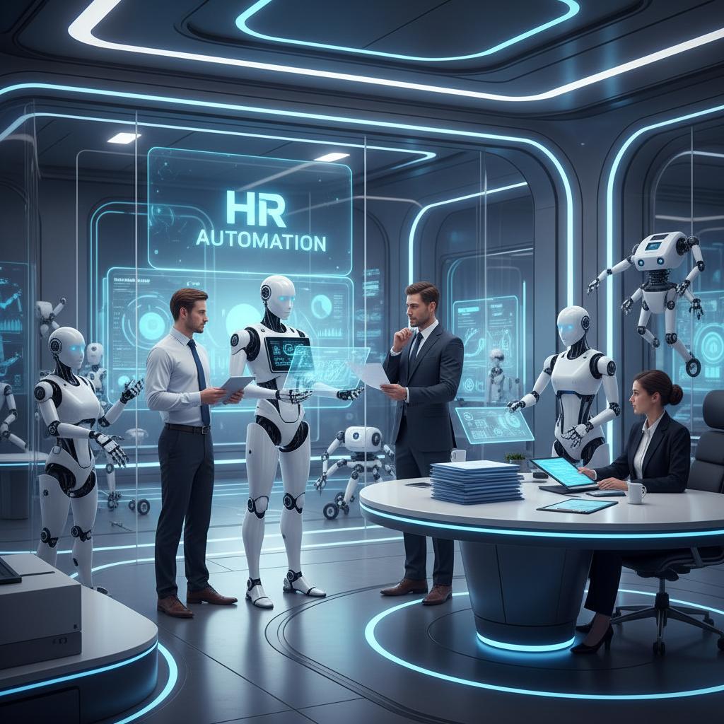 Image: Futuristic HR office with AI-generated document holograms, illustrating the rise of next-gen HR automation.