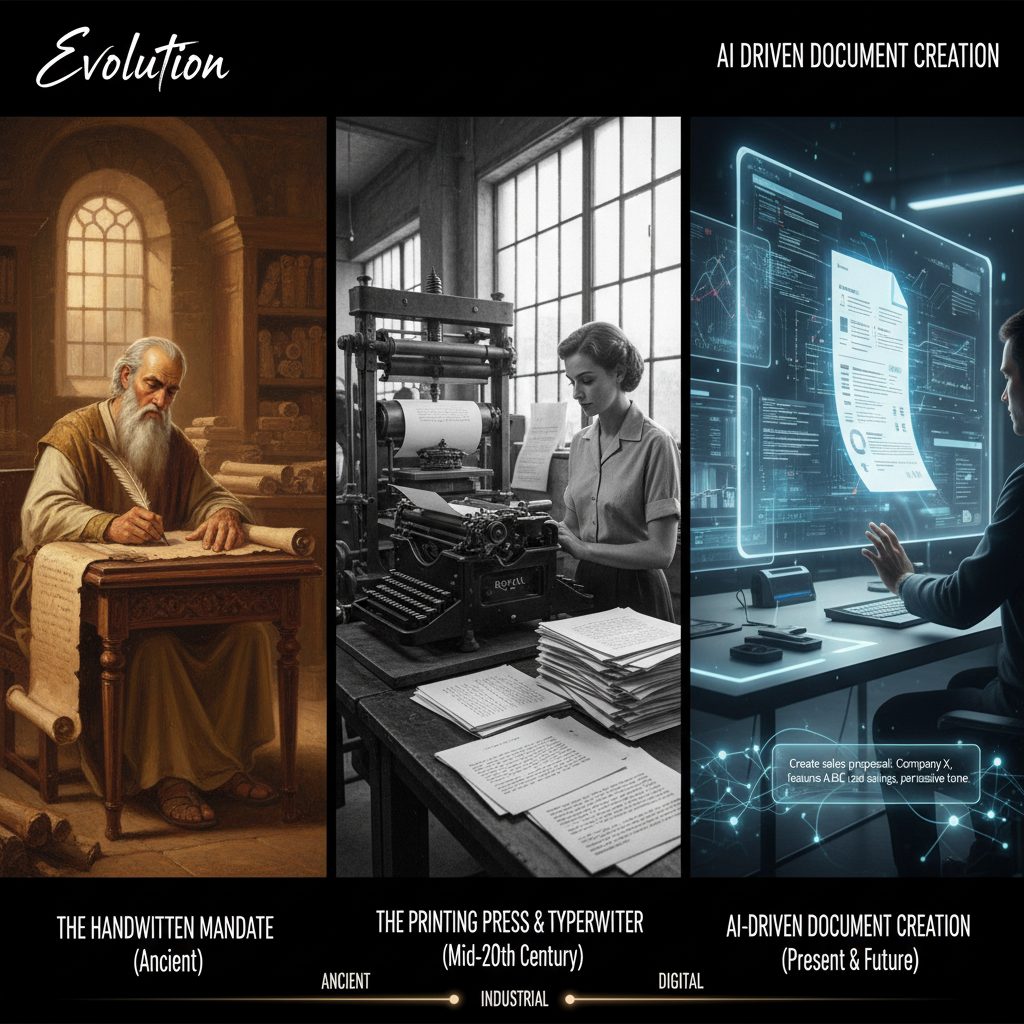Descriptive alt text: Split image of historic office with handwritten documents and modern workspace with AI document generator, illustrating the evolution of official notices
