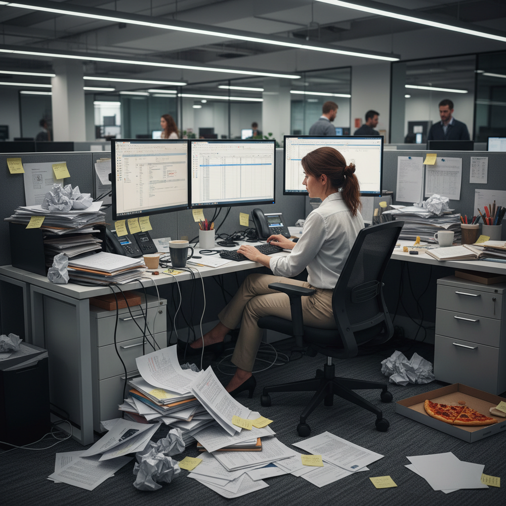 Alt text: Project manager transforming chaotic paper project documents into organized digital files, highlighting documentation automation.